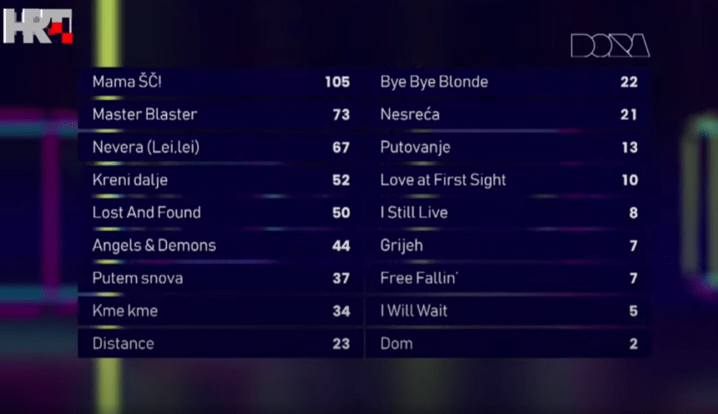 Meri Andraković – Bye Bye Blonde – גם שיר זה מתחיל בצליל טכנו עצבניים. היא לובשת בגד גוף שחור-סגול עם חלקים שקופים, משל הייתה ביונסה. על הבמה עמה ארבע רקדניות בלבוש דומה. הביצוע הווקאלי די עלוב, והעיבוד הכבד מטביע את הקול החלש שלה. מלודית, זה שיר חלש, למרות שהוא מנסה להיות המנון פופ רטרואי משנות השמונים. זה גילטי פלז'ר בסטודיו בלבד. 3/5.