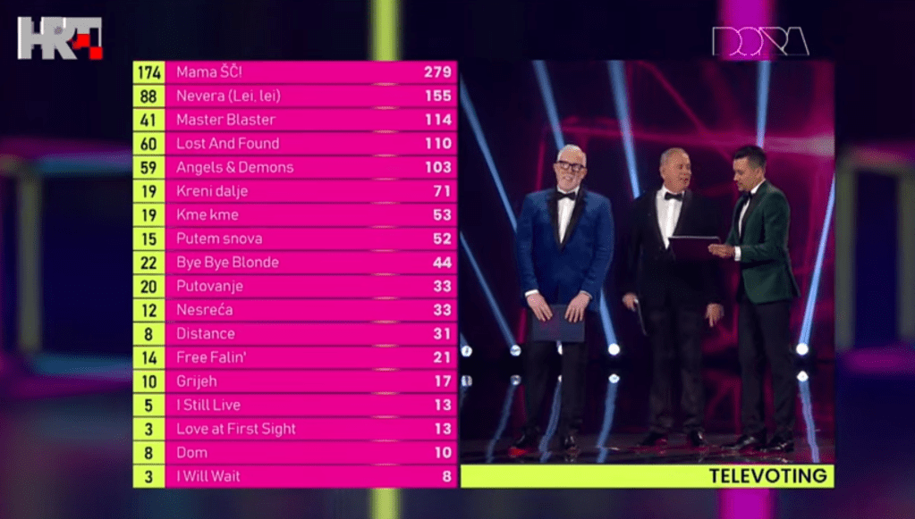 Damir Kedžo – Angels and Demons – זוכה הקדם ב-2020 חוזר, אחרי שהאירוויזיון בו היה אמור להשתתף בוטל. הפעם עם שיר באנגלית. הוא כנראה מרגיש מאד בטוח בנצחונו. השיר הוא בסגנון Rag'n'Bone Man בבית, ובפזמון הופך להיות המנון פופ-טכנו דרמטי. הוא לובש טייק מדורני ומסמורטט על בגד אבירים ימי ביניימי. אורות אדומים שוטפים את הבמה. אלומת אור בצבעים משתנים מאחוריו. זה נורא מתאמץ, אבל נורא חלול. עלייה של חצי טון בפזמון האחרון. 2/5.