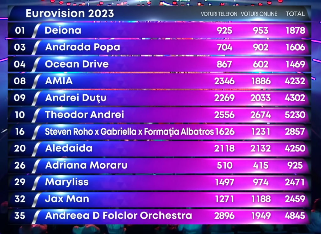 Adriana Moraru – Faralaes – בסקירת השירים כתבתי: "עוד שיר ברומנית, הפעם עם ספרדית. תופיפ אפריקאים ברקע, נגינת גיטרה אקוסטית. הקול שלה לא הכי מרשים, קצת זמרת ליווי או זמרת עם. הביט אפקטיבי, אבל העיבוד הולך והופך כבד. הפזמון הפופ-לטיני זול באופן מיוחד. הקול שלה גרוני לפרקים. זה לא זה, גם אם זה לא נורא. גם כאן יש ברייק עצבני, שנועד לאיזה ריקוד. לא מהודק, ונורא רוצה להיות להיט כשיהיה גדול. 3/5."