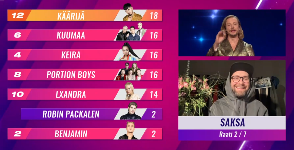 Käärijä – Cha cha cha – בסטודיו: זה ה-פייבוריט הגדול של עונת הקדמים, לפחות עד השגיעה Loreen. להיט טכנו מתכתי עצבני ומאד פיני. ראיתי הרבה השוואות ל-Electric Callboy ול-Rammstein. אחרי הפזמון השני, השיר הופך לפופ-טכנו רקיד וקליט. ה-צ'ה צ'ה צ'ה מאד אפקטיבי. אני ממתין בכליון עיניים לצפות בזה בלייב. 3/5.