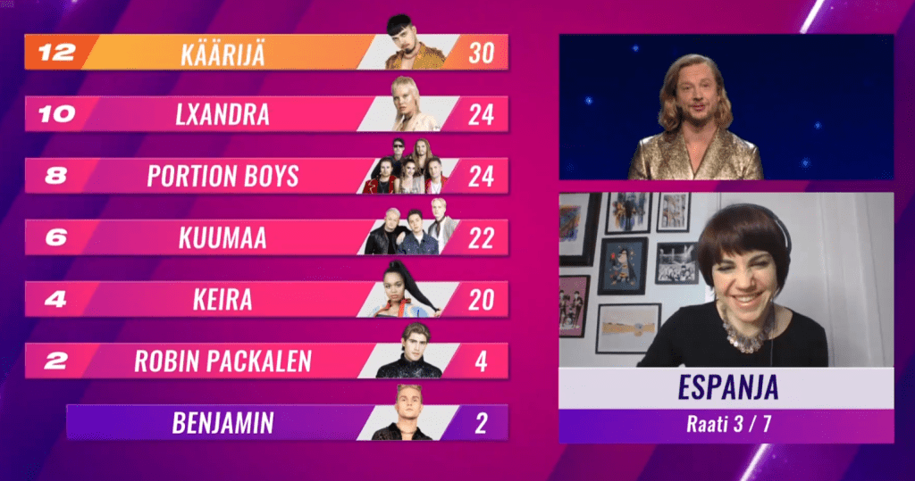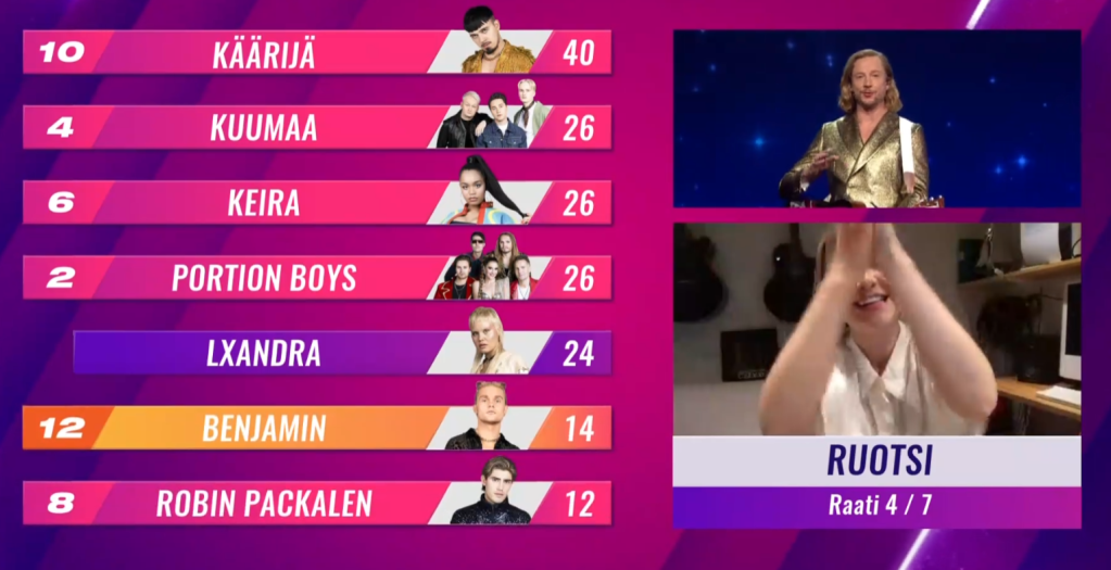 Benjamin – Hoida mut – בסטודיו: גרסה מודרנית של להיטי הפופ הפיניים, שהיינו רגילים לשמוע באירוויזיון בשנות השמונים. הרבה דרמה במלודיה ובעיבוד, אשר גם נבנית עד לפזמון, הקליט, הקאמפי והגדול מהחיים. מסוג השירים שרק פינלנד יכולה לשלוח. עושה חשק לרקוד. 3/5.