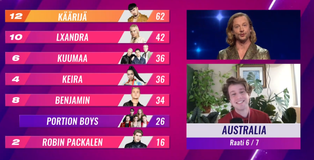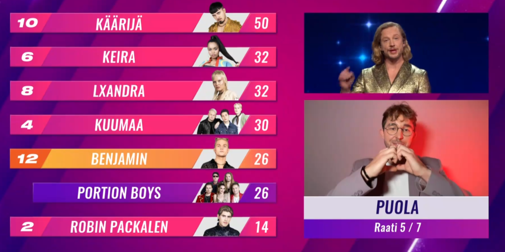 Kuumaa – Ylivoimainen – בסטודיו: הפייבוריט השני של הערב. להיט אלקטרו-פופ קליט ומיידי. פזמון בעל צליל אדיש ודרמטי בו זמנית, שלוקח לסוף האייטיז-תחילת הניינטיז. זה חמוד מאד, ונשמע כמו משהו שלדעתי הפינים ילכו עליו. לצערי זה חלבי מידי, לא מעז מספיק. אולי צוותי השיפוט יטו את הכף לתוצאה הנכונה. 3/5.
