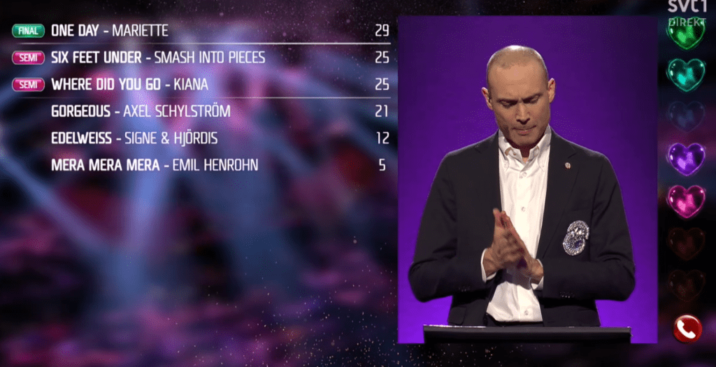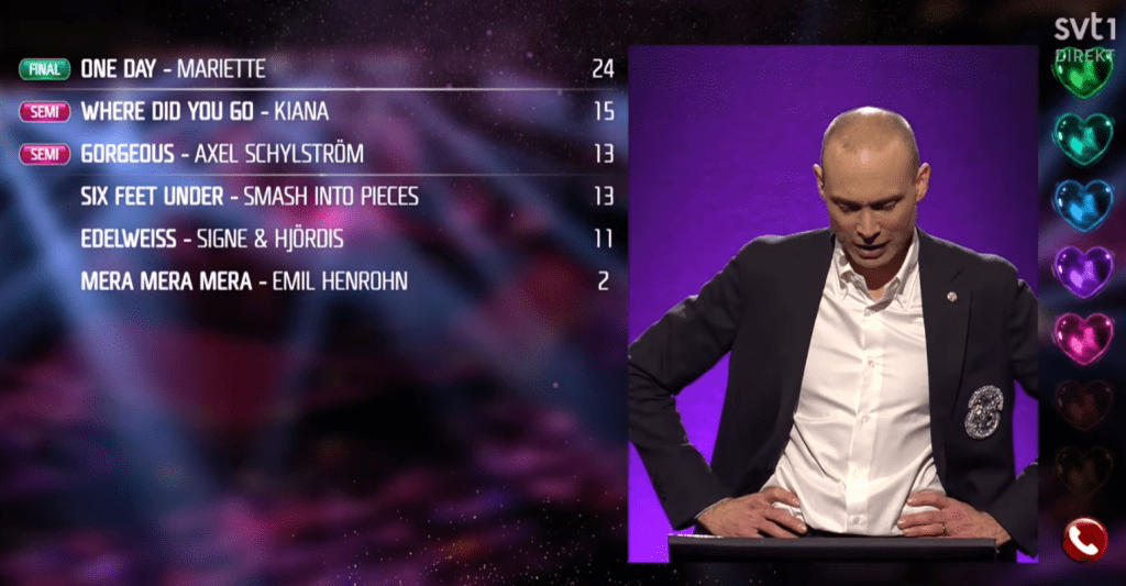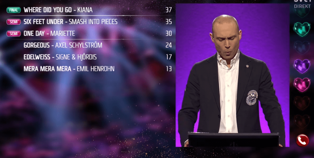 Loreen – Tattoo – היא מתחילה את השיר לכודה בין שני מסכי LED. היא שוכבת שם בדקה הראשונה של השיר. בבית השני נכנס הביט והמסך העליון מתרומם, כאילו היא דוחפת אותו מעלה. על שני מסכי ה-LED מופיע וידאוארט של חול, הנע עם הזמרת ותנועותיה. כמו בשירה מ-2012, גם כאן יש משחקי תאורה אפקטיביים. אחת ההעמדות האפקטיביות אי פעם בתולדות הקדם השבדי. השיר נפתח במה שמנסה להישמע כמו "Euphoria". הבתים נשמעים כמו שיר של ABBA. הגשר הוא של שיר מלודיפסטיבלן. הפזמון הוא צעקות דרמטיות, שהיא מזייפת בו קצת. עבודת המצלמות הולכת לאיבוד בלייב. ההופעה נפסקת!