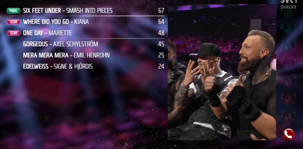 Smash Into Pieces – Six Feet Under – הרבה מסכי LED, שיוצרים מראה של עיר בלילה, כאילו בתלת מימד. כשיר רוק זה לא כזה חזק. מזכיר את הסגנון של Dead By April ו-Blind Channel. הפזמון עצמו פופי מאד וקליט. הם לבושים במה שנראה כמו אפוד מגן. זו גרסת השלאגר של הרוק הכבד, תסלחו לי, כן? עם זאת, אני לא שונא את זה לחלוטין. יש מצב שזה עולה לגמר. 3/5.