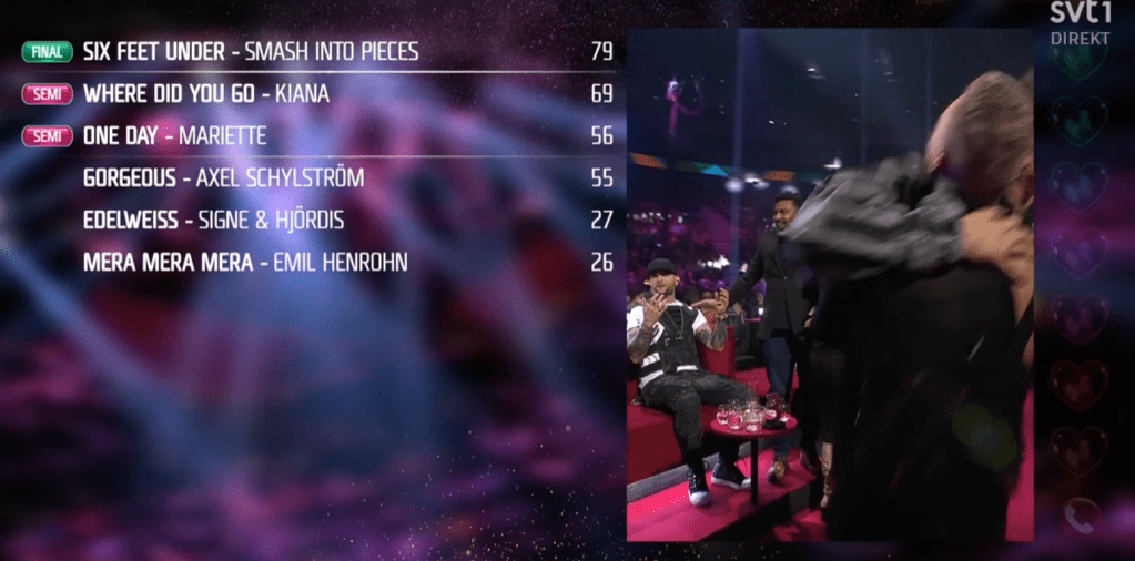 פתטי. הקווים פתוחים כעת עבור ששת השירים הנותרים. במופע הביניים, Carola מגיעה למופע מחווה לכבוד 30 שנים לשיר המלודיפסטיבלן והאירוויזיון הראשון שלה, הלהיט "Främling".