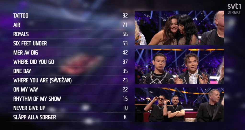 Theoz – Mer av dig – בטרום הגמר כתבתי: "שיר קצבי ורקיד, להיט קיץ וביטים של מועדונים. מזכיר מאד את "Som du vill" שלו. הוידאוארט כאילו מפוקסל ועמו על הבמה שני רקדנים. הוא לובש ז'קט ירוק בקבוק וחולצה לבנה מתחת. יש פירוטכניקה. השיר בשבדית מלאה, האווירה שמחה, שלאגריסטית, ההופעה זורמת. אולי זה DTF? מה שבטוח, זה להיט, עם הרגשת Throwback. נכון לעכשיו, זה הכי קומפטטיבי. הקהל משתגע. 3/5."