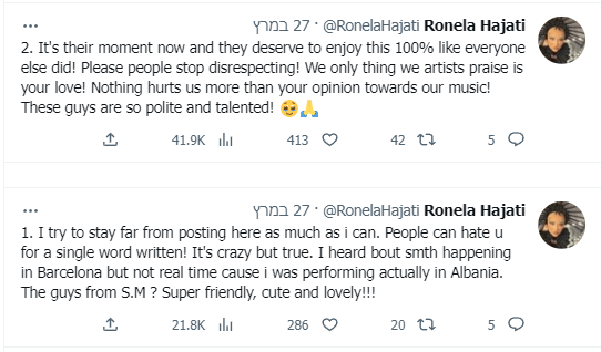 Ronela Hajati פרסמה בעצמה הודעת תמיכה בלהקה: