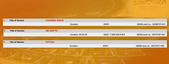 שיר בשם "Chasing Highs" נרשם בארגון הכותבים המקומי עוד ב-2022, ועוד לפני שהשיר שייצג את המדינה ב-2022, "De Diepte", נרשם: