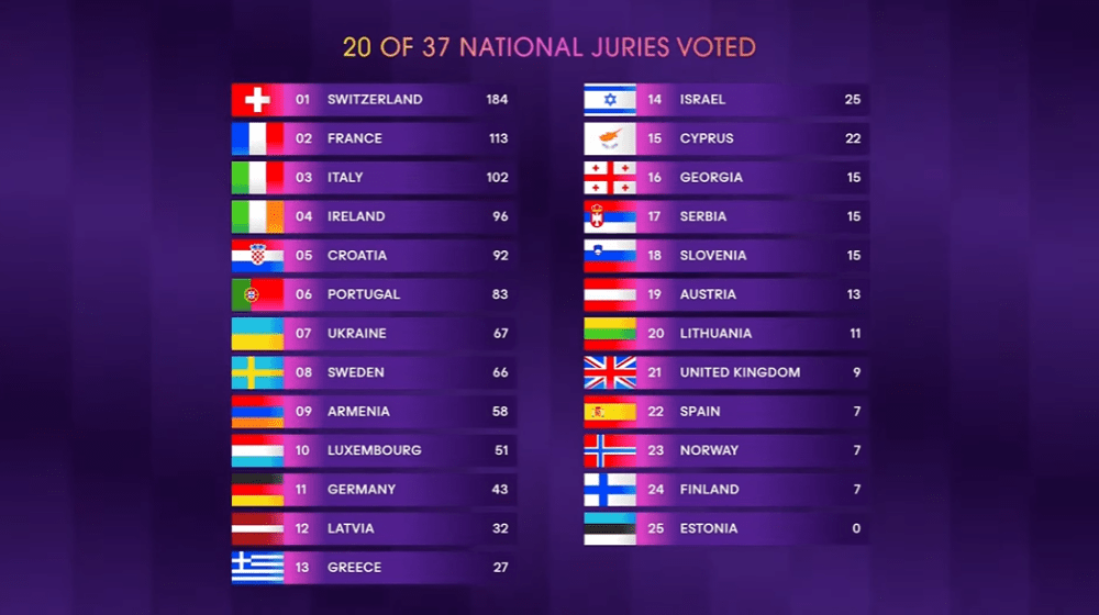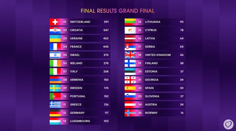 * בגמר שווייץ מקבלת נקודות מ-35 צוותי שיפוט. קרואטיה וצרפת מ-30 צוותים. אוקראינה מ-28. קרואטיה וצרפת מקבלות נקודות מכל נקודות הטלווטינג – 37 במספר. אוקראינה ושווייץ מקבלות מ-36 נקודות טלווטינג וישראל מ-35.