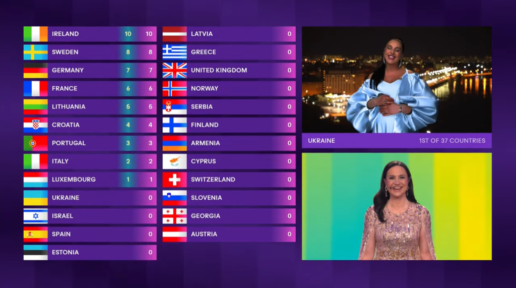 את ההצבעה של הולנד מקריא Martin Österdahl על רקע קריאות הבוז של הקהל. ההולנדים ביקשו לא להקריא בעצמם את הנקודות שלהם על רקע פסילת נציגם. אחרי 25 הצבעות, קרואטיה עולה למקום הרביעי, פורטוגל עולה לחמישי. אחרי 30 הצבעות, קרואטיה עולה למקום השלישי. אירלנד עולה לחמישי. אחרי 35 הצבעות, אוקראינה עולה למקום החמישי.