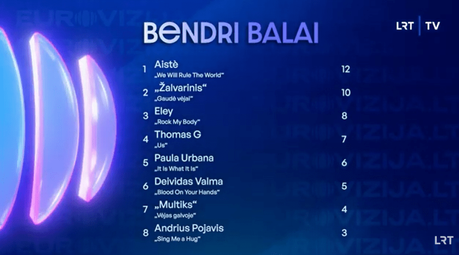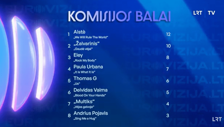 Aistè – We Will Rule the World – זאת לא האייסטה שאנו מכירים מאירוויזיון 1999 ולא זאת שמנסה את מזלה כבר 25 שנים בקדמים. האייסטה הנוכחית עולה במכנסי פדלפון וגופיית בטן בכסף נוצץ. מצטרפים אליה 4 רקדנים ונגן קלידים. השיר הזה רוצה להיות להיט דיסקו, אבל חסר לו גרוב, חסר לו Fאנק וחסרה גם מלודיה אפקטיבית. זה נשמע בעיקר מאד חובבני. ווקאלית היא לא שם. 2/5.