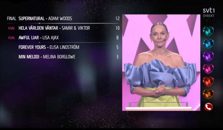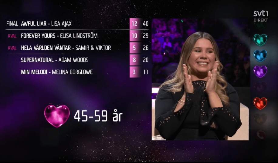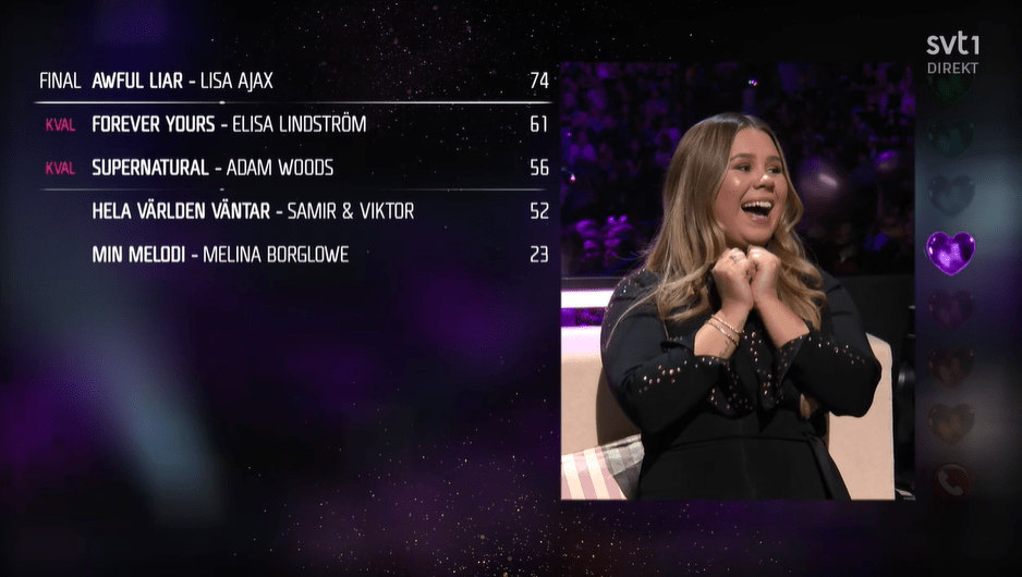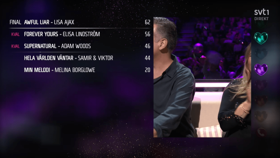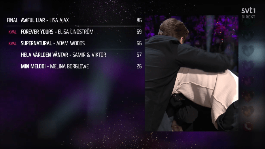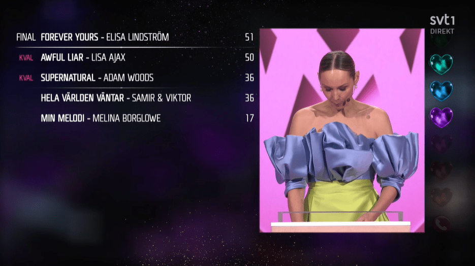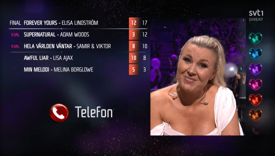 Elisa Lindström – Forever Yours – היא זמרת דאנסבנד והשיר, שהוא בז'אנר זה, כבר נעשה בעבר במלודיפסטיבלן. מדובר בהמנון שלאגר שמח, שמתאים ל-Perrelli, עם נגיעות של ABBA. הפזמון פופי ומיידי. על הבמה פודיום ומכונת רוח. מסך ה-LED בוהק בצבעים זוהרים ואבק כוכבים. ווקאלית היא לא הזמרת הכי מדהימה, וזה משהו ש-Perrelli יכלה לבצע הרבה יותר טוב. כשיר זה די רקוב. היא מבצעת את זה ממש שטוח מבחינה ווקאלית. יש 3 יריות של זיקוקים מ-8 עמדות לקראת סוף השיר עם המודולציה.