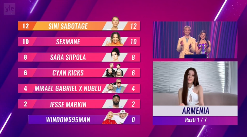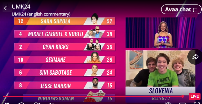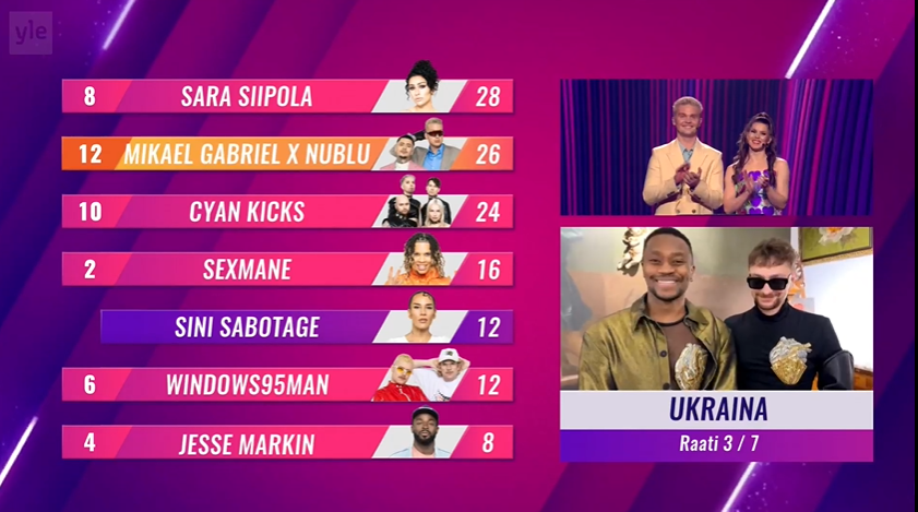 Mikael Gabriel and Nublu – Vox populi – בסקירת השירים כתבתי: "פופ-Pאנק עם ראפ ומוזיקת טכנו משוגעת. זה שמח, מטורף במידה, הביט סוחף והפינית יושבת בול על השיר הזה. עוד השפעה של Käärijä על הקדמים השנה, והפעם השפעה מקומית. השיר נשמע כאילו הוא במהירות של 1.5 בפזמון. זה בנוי להופעה באולם האירוויזיון, קליט ומשובב נפש. השאלה היא האם Mikael Gabriel, שהסתבך פוליטית עם אמירות כאלה ואחרות, יצליח לסחוף אחריו מספיק מצביעים. 3/5."