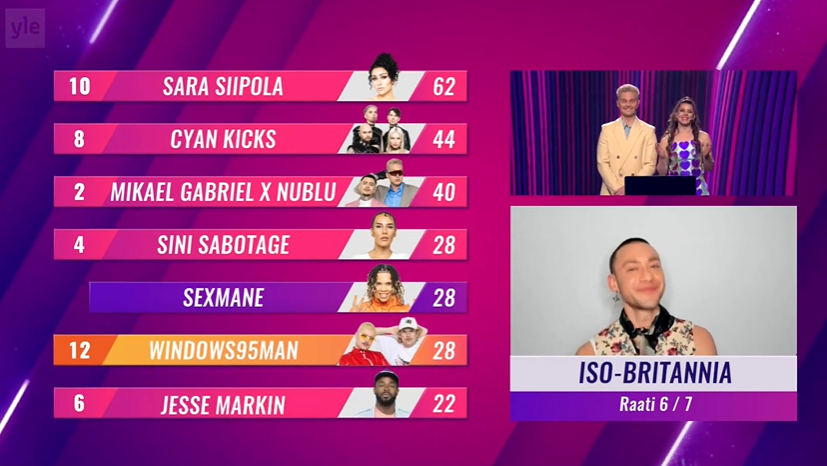 Windows95man – No Rules! – בסקירת השירים כתבתי: "אירופופ של שנות התשעים שלאגריסטי ומטופש, כאשר ויזואלית יש כאן השפעה ברורה מ-Käärijä. מוזיקלית זה לא מחזיק. זה דאנס-פופ מיושן, שמנסה לתת קריצה, אבל נשמע כמו שיר בית אבות. לעטות על עצמך דמות זה לא נותן לך פטור מלכתוב שיר. לשיר יש את המודולציה הצפויה בתבל. אין לזה מקום בקדם פורץ דרך כמו זה הפיני. 2/5."