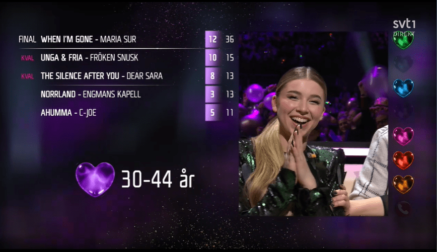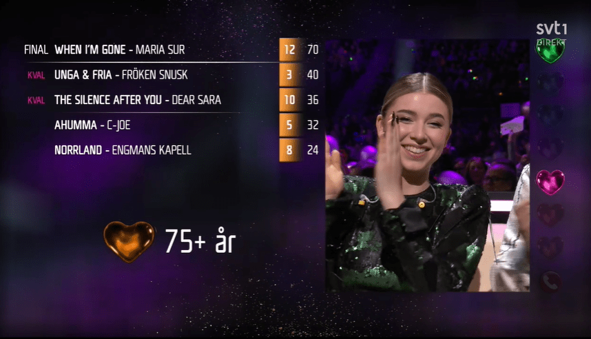במופע הביניים, היכל התהילה של המלודיפסטיבלן. יש התמקדות במלודיפסטיבלן 1987, כי מי שנכנסת הערב להיכל התהילה היא לוטה, נציגת שבדיה באירוויזיון 1987.