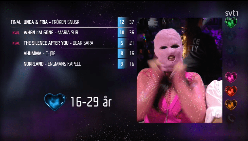Fröken Snusk – Unga & fria – זה נשמע כמו שיר דאנסבנד שעבר עיבוד מחדש. הצבעים השולטים הם ורוד, ירוק ולבן. האווירה היא אנרגטית, של פסטיבל עממי. היא רוכבת על סוס. עמה על הבמה שישה רקדנים בחצאיות ורודות או מכנסיים לבנים. זה שיר מסריח למדי, וכמובן שהוא הולך להיות חביב חובבים אחרי טרום הגמר הזה. זה ממש דרעק באווירה כפרית. לא הבנתי למה היא צריכה את המסכה המטופשת הזו. מה הגימיק פה? 2/5.