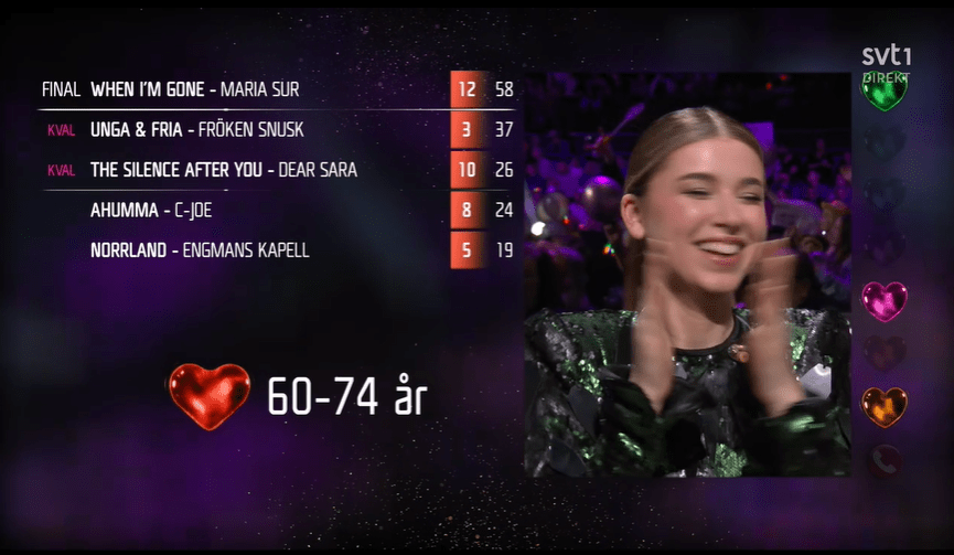 Engmans Kapell – Norrland – הופעת בכורה למתמודדים המבוגרים ביותר במלודיפסטיבלן השנה. הם מגיעים מנורלד. מוזיקלית, האווירה היא שבדית כפרית. הצבעים השולטים הם אדום, לבן וצהוב. האווירה היא של הופעה חיה, חמימה, הופעה בבר השכונתי אם תרצו. על הבמה שני פודיומים קטנים. קיר ה-LED מציג לב ובפזמון קונפטי. זה הכי שיר שייקבר בטרום הגמר ולא ימשיך הלאה. זה מחויך, שמח, אבל גם קלישאתי מאד. בסוף השיר נכנס הכינור ויש מודולציה. קונפטי נורה משני מקורות. מסך ה-LED נפתח ומוחלף בתאורה. 3/5.