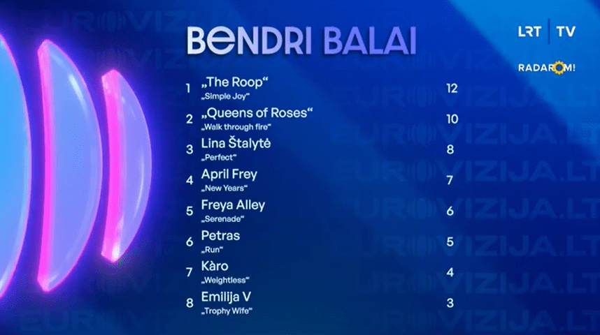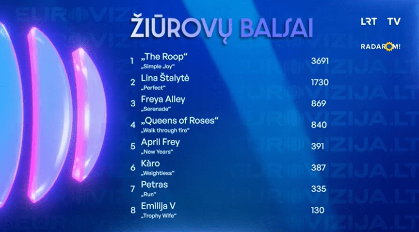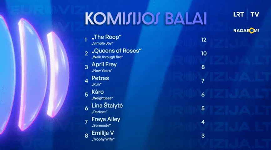 The Roop – Simple Joy – נציגי ליטא בשנים 2020-1. אינדי-פופ מחויך וחביב, אבל לא קומפטטיבי כמו שני השירים הקודמים שלהם בתחרות. צליל השריקה קליט וזכיר. יש לשיר הוק סביר, לא מדהים. הבמה פשוטה. לא ניתן לזלזל בערך הכריזמה של הסולן והפופולריות של הלהקה בקרב הקהל הליטאי. הסולן בחולצה ירוקה עם מחשוף V וקישוטים מכסף עליה, ומכנסיים שחורים קצרים. שני הנגנים לבושים בשחור, אחד מהם בחליפה. 3/5.