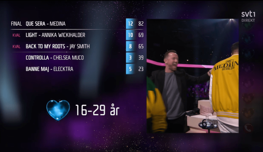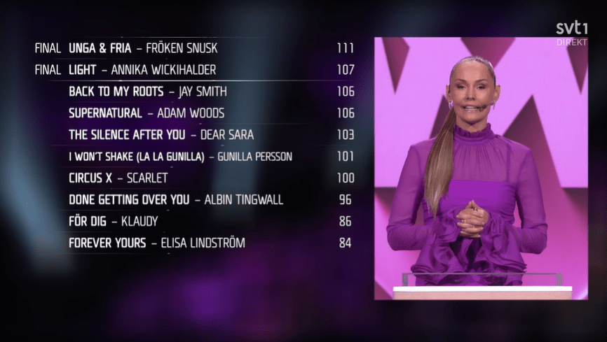 מה שאומר ש-Annika Wickihalder ו-Jay Smith עולים לגמר. תוצאות הזויות, ושיטה שתיעדפה את השירים שהופיעו הערב.