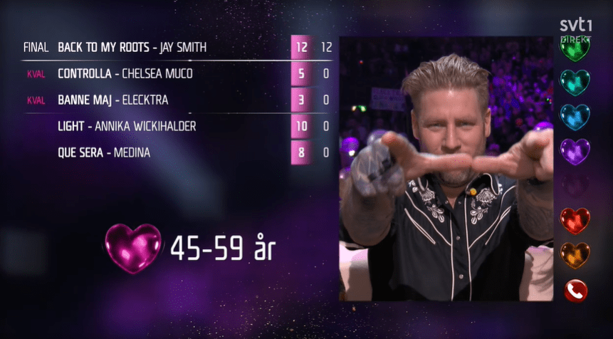 Jay Smith – Back to My Roots – קאנטרי-רוק אמריקאי. חייבים כמה כאלה במלודיפסטיבלן מידי שנה. הסקנדינבים משום מה מחבבים את הז'אנר, אולי כי הוא לא כזה רחוק מהדנסבנד שלהם. הסאונד האמת הוא פחות קאנטרי ויותר פופ המנוני א-לה One Direction ודומיהם. מבחינה ויזואלית, ההופעה בנויה כהופעה של להקת רוק בארה"ב, עם שלט גדול מאחורה שעליו שם השיר. אבל השיר עצמו לא רוק, לא משנה כמה חזק תתאמצו. 3/5.