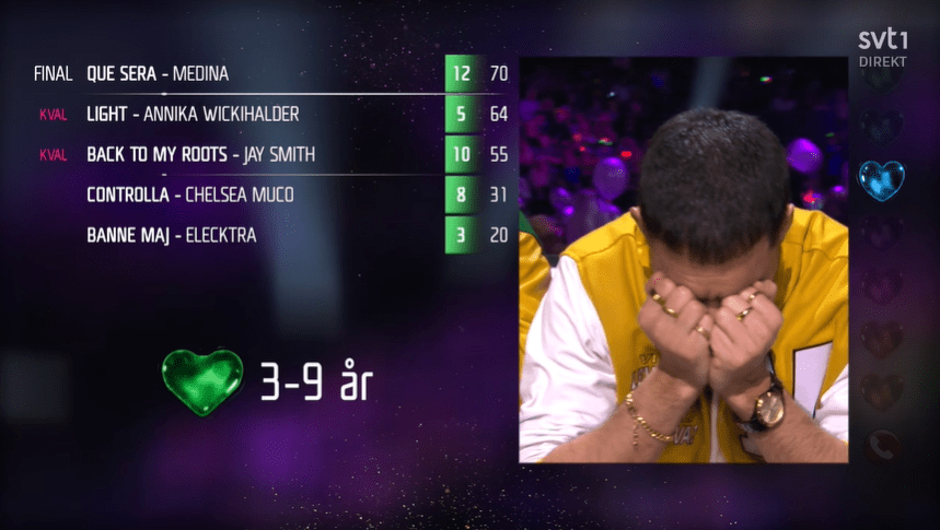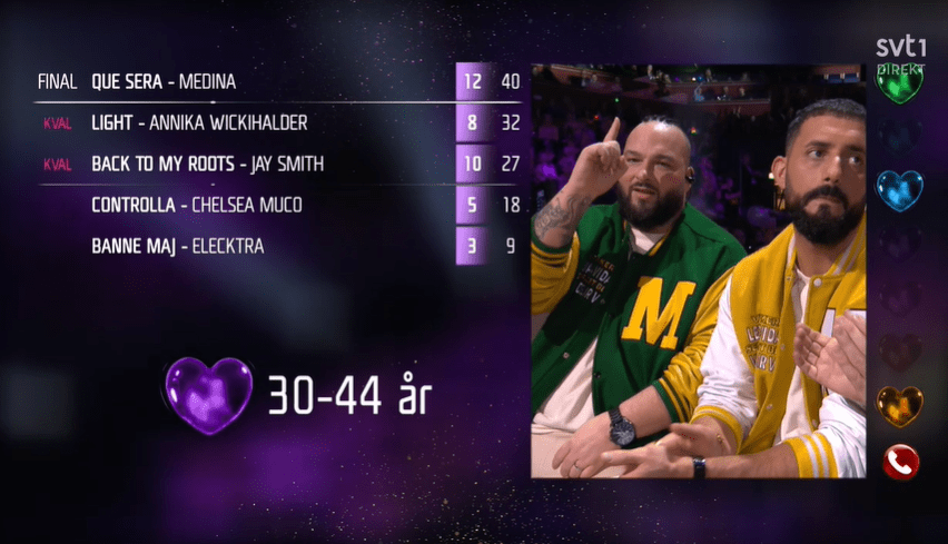 Medina – Que Sera – שיר sing along המזכיר את המנוני גביע העולם בכדורגל. המנון קייצי, שנועד לבמה הגדולה. גם כאן יש מודולציה. יכול להיות שהם ייקחו את הגביע וייצגו את שבדיה במאלמו? מסכך ה-LED מראה רחבה של פסטיבל מוזיקה. על הבמה יש מגברים גדולים, מתוכם יוצאים רקדנים. זה מזכיר את "סה לה וי" של קובי פרץ והמנוני אירועי ספורט דומים. לא בשבילי. 2/5.