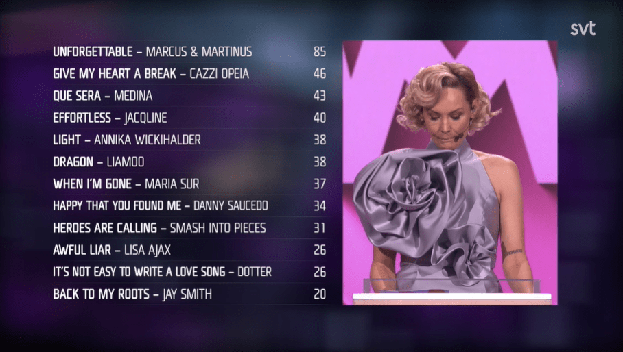 Marcus & Martinus – Unforgettable – בטרום הגמר כתבתי: "הפייבוריטים הגדולים נבחרו לפתוח את הערב. האינטרו והבתים הם סינת'-פופ, המובילים לגשר חזק מאד ולפזמון לא פחות חזק. לאחר מכן יש דרופ אלקטרוני. מדובר בהאוס-פופ להיטי, שמזכיר קצת את The Weeknd ואף את Michael Jackson. ההופעה נראית כמו ההופעה של Loreen אשתקד רק במאונך. זה עשוי כהלכה, אם אתם אוהבים שירי פופ מהוקצעים וחסרי נשמה. יש לזה תוקף מאד קצר לטעמי. השיר מסתיים בבת אחת. 3/5."