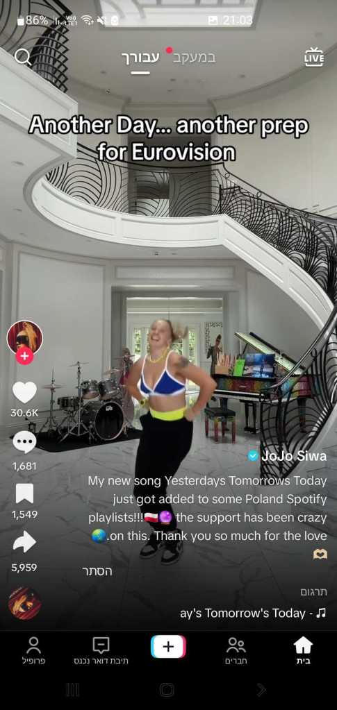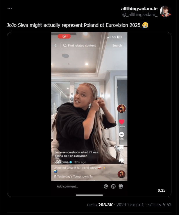 הזמרת האמריקאית JoJo Siwa כנראה מטרילה, כי היא מעלה סרטוני טיקטוק עם כיתוב, שהיא מתכוננת לאירוויזיון, בצירוף דגל פולין: