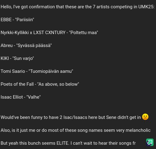 בפורום של ESCUnited נטען כי אלו רשימת המתמודדים והשירים בקדם הפיני המתקרב: