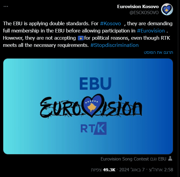 * RTK, רשות השידור הקוסובארית, הגישה בקשה להשתתף באירוויזיון 2025 (מקור), אך נדחתה מאחר והיא לא חברה באיגוד השידור האירופי. רשות השידור הקוסובארית טוענת למוסר כפול, שכן היא לא מתקבלת לאיגוד מסיבות פוליטיות, לטענתה: