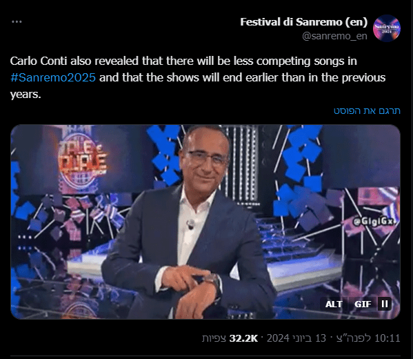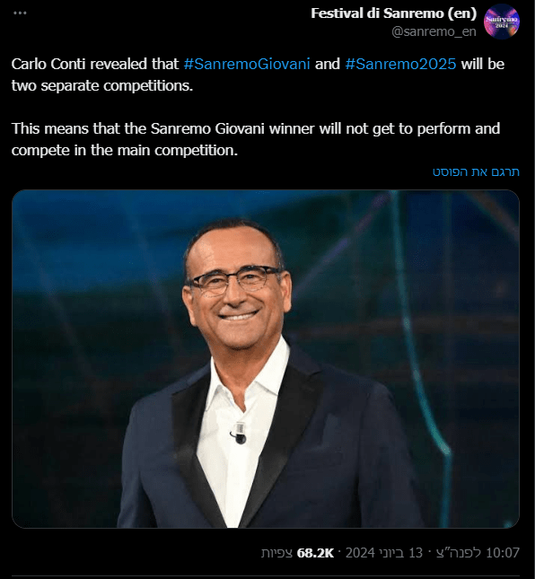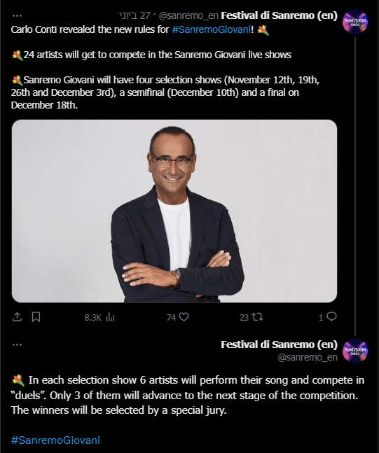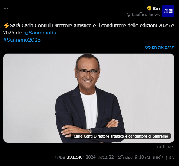 אושר כי Carlo Conti יהיה המנהל האמנותי והמנחה של פסטיבל סנרמו 2025: