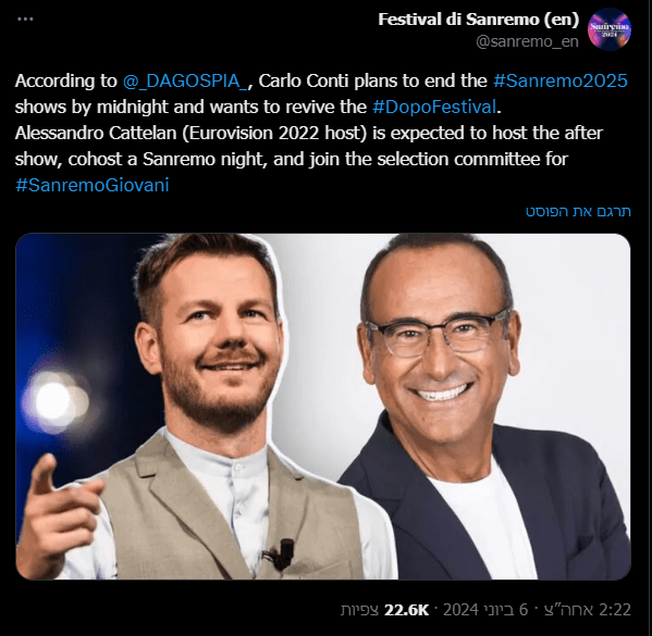 Alessandro Cattelan, מנחה אירוויזיון 2022, צפוי להנחות את התכנית שאחרי הסנרמו, להנחות את אחד מערבי פסטיבל סנרמו ולהיות חבר בצוות הבוחר את השירים לפסטיבל: