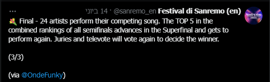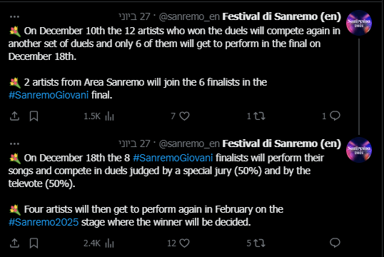 פורסמו חוקי פסטיבל סנרמו 2025. התחרות תיערך כדלקמן: