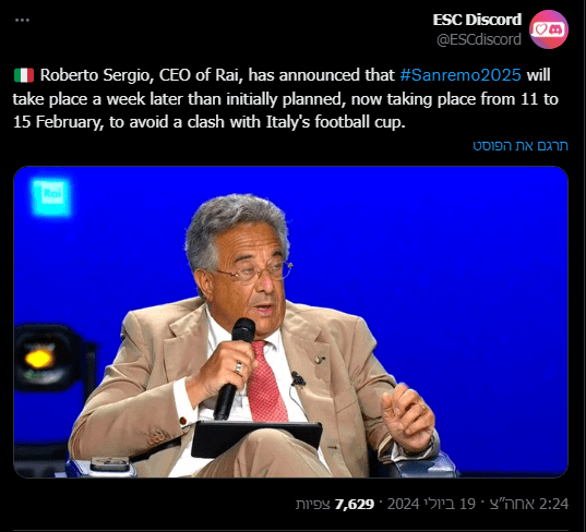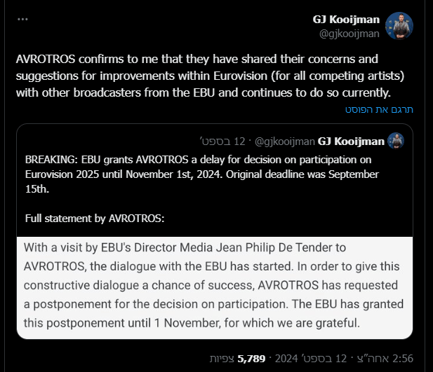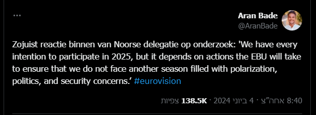 * בחודש מאי הכריז איגוד השידור האירופי על בחינה עצמאית של האירועים סביב האירוויזיון 2024. ההליך היה בהובלת מומחה בלתי תלוי מהתעשייה, אסף משובים ממגוון רחב של מבעלי עניין, כולל ראשי משלחות, חברי קבוצת הליבה של האירוויזיון, מועצת המנהלים של התחרות, כמו גם צוות הליבה של איגוד השידור. ב-1/07 הודיע האיגוד על סיום הבחינה. זוהו שלושה תחומים שיתייחסו להמלצות בחודשים הקרובים לחיזוק והגנה על תחרות האירוויזיון של 2025, ועל כל האירועים העתידיים. אלה הם: משילות והשתתפות של האיגוד; בטיחות וניהול סיכונים; מעורבות קהל, מעריצים ומדיה. נותר תפקיד של מנהל האירוויזיון, שידווח לסגן המנכ"ל ומנהל המדיה של האיגוד. תחתיו יהיה המפקח מטעם איגוד השידור האירופי, שיוכל להתפנות לטפל בנושאי הפקה, בראשי המשלחות ובבניית קשרים בין חברי האיגוד. תפקיד נוסף שיהיה תחת מנהל האירוויזיון הוא של ראש מותג ומסחר של האירוויזיון. בתחום משילות והשתתפות של האיגוד, תובהר אחריות קבלת ההחלטות של הגופים המנהלים השונים של האירוויזיון, תוך הבטחה שישמעו דעות מגוונות של כל החברים באיגוד. יובהר התפקיד של הגופים המנהלים והאחריות של צוות הליבה של האירוויזיון, כמו גם תפקידם של ראשי המשלחות והאחריות של האמנים המשתתפים. בתחום בטיחות וניהול סיכונים, תשופר ההבנה של כללי התחרות בקרב כל קבוצות העניין, כולל האמנים, תוך התמקדות בפישוט ושיפור הנגישות. יחוזקו הפרוטוקולים הקיימים של התחרות לניהול משברים ויחוזקו הוראות האבטחה והסייבר של התחרות. בתחום מעורבות קהל, מעריצים ומדיה ייבחן שיתוף פעולה מוגבר עם קבוצות מעריצים, משפיענים ומדיה לבניית מעורבות רחבה יותר, המבוססת על ערכי התחרות. יובטח כי האירוויזיון ימשיך להיות מופע, הפונה לקהלים מרובים בגילאים שונים. מקור.