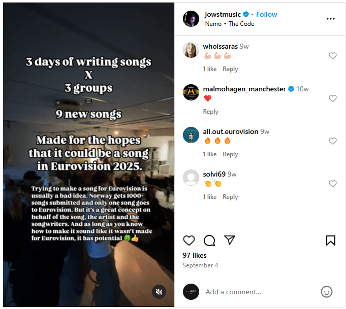 נציגת 2024, Bambie Thug, ציינה כי הייתה חוזרת לאירוויזיון בתור כותבת לנציגי 2011-2, Jedward. מקור.