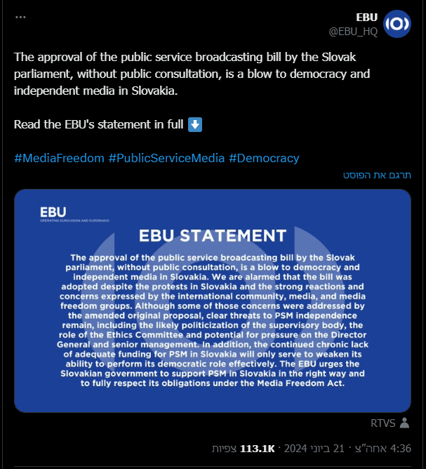 להוסיף חטא על פשע, הממשלה הסלובקית החדשה מתכוונת לסגור את רשות השידור הקיימת ולהקים חדשה במקומה. איגוד השידור האירופי יצא נגד המהלך: