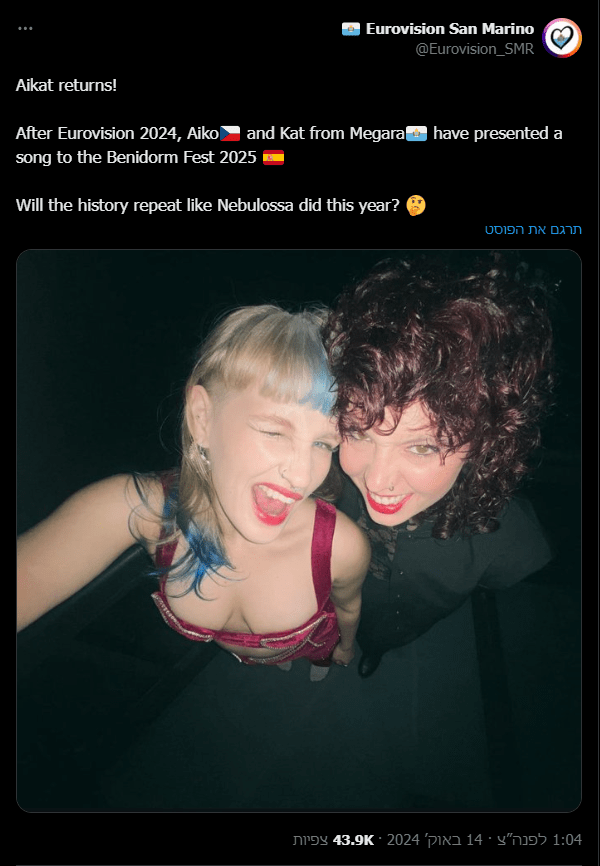 Aiko, נציגת צ'כיה 2024, שלחה שיר לפסטיבל בנידורם, ביחד עם Kat מההרכב Megara, נציגי סן מרינו 2024: