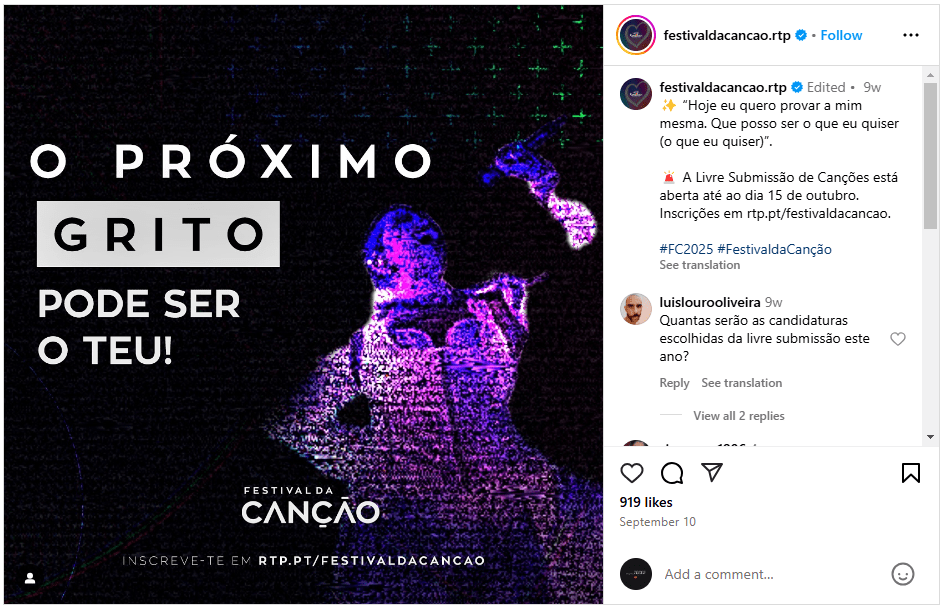 חלון הזמן לשליחת שירים לפסטיבל הפורטוגלי היה בין התאריכים 14/08-15/10. 20 שירים יתמודדו בקדם: 14 שירים יגיעו ממלחינים שהוזמנו מראש, 6 שירים יגיעו מהמסלול הפתוח. מקור. את חוקי הקדם (בפורטוגלית) ניתן לקרוא כאן.