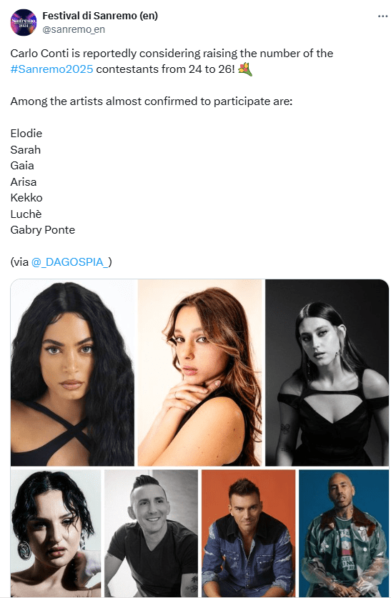 Carlo Conti שוקל להעלות את מספר המשתתפים בפסטיבל סנרמו ל-26, וגם יש כמה שמות, שנטען שהם בטוח משתתפים: