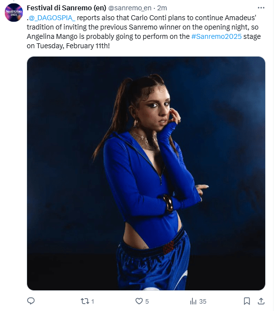 הוא גם רוצה שזוכת הפסטיבל של 2024, Angelina Mango, תופיע בערב הפתיחה של הפסטיבל ב-11/02/25: