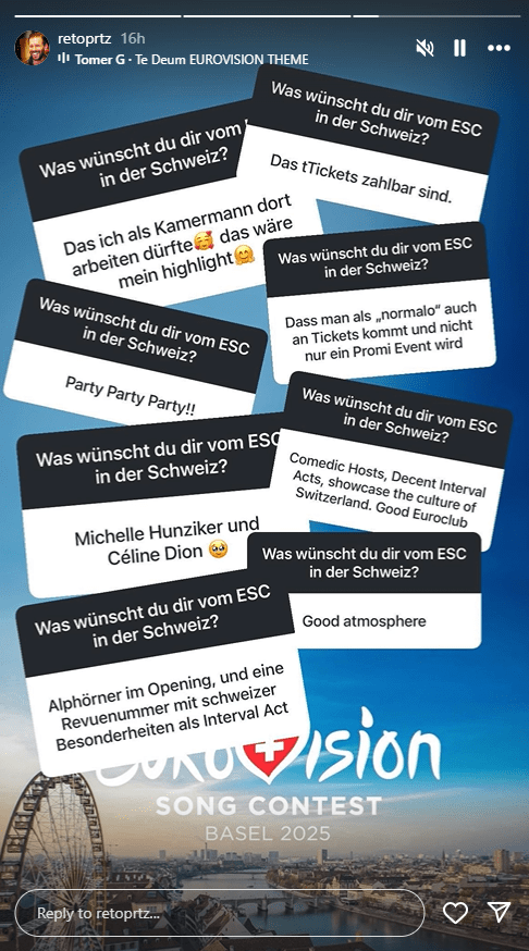 * אחד ממפיקי התחרות הקרבה, Reto Peritz, שאל את עוקביו מה הם מצפים מהאירוויזיון, וקיבל תשובות של שונות הנעות בין Celine Dion, כרטיסים במחיר שפוי לבין אספקת עבודה: