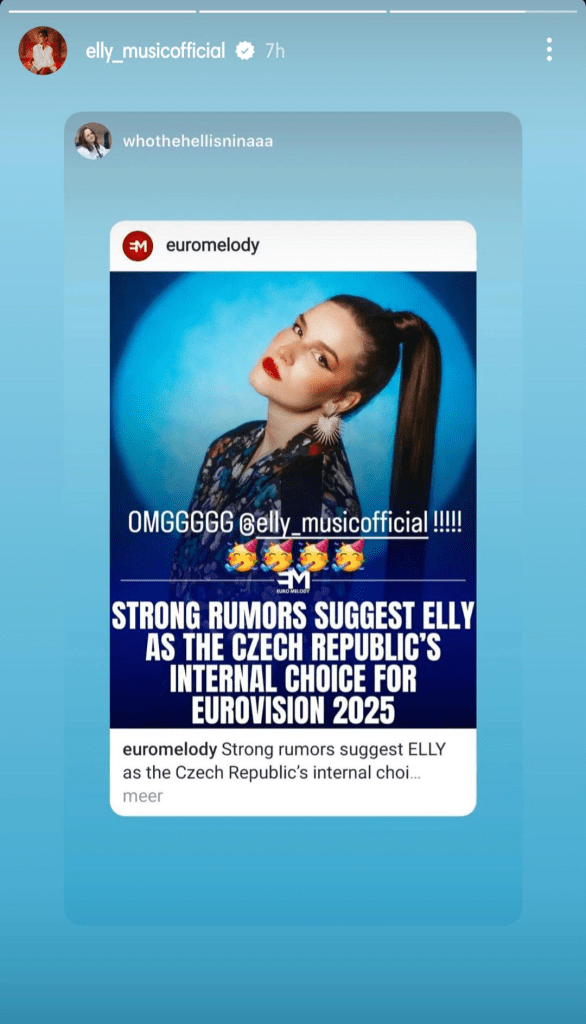 Elly, שסיימה במקום השני בקדם 2024, פרסמה מחדש סטורי, שהעלה עוקב שלה, שבו כתוב שהיא נבחרה לייצג את צ'כיה ב-2025. האם היא מצהירה בגלוי שנבחרה?