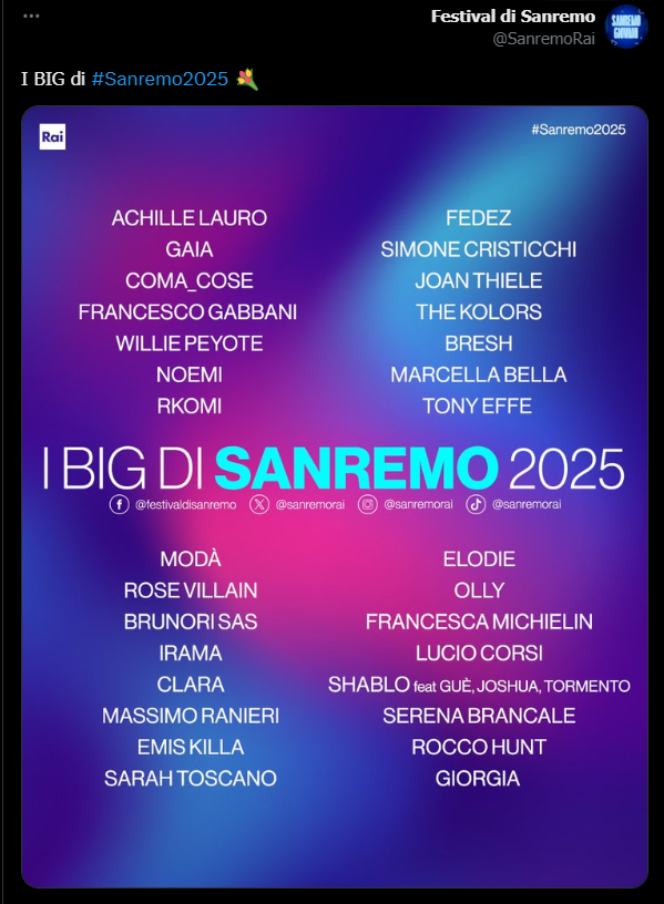 נחשפו מתמודדי פסטיבל סנרמו 2025: