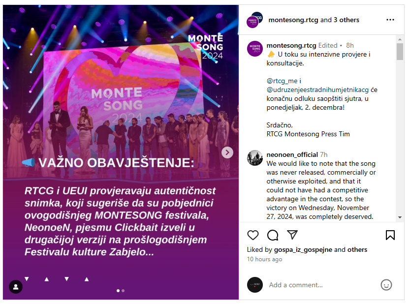 רשות השידור של מונטנגרו הודיעה כי היא חוקרת את המקרה ותקבל ב-02/12 החלטה עם איגוד השידור האירופי: