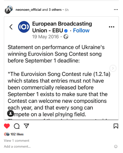 בחשבון האינסטגרם שלהם, הם העלו סטורי של חוקי התחרות מ-2024 (מצוין שם ששיר יכול להתפרסם רק אחרי ספטמבר 2023, ולא 2024). בנוסף, ופרסמו את ההצהרה של איגוד השידור האירופי בדבר אי הפסילה של Jamalaושירה ב-2016: