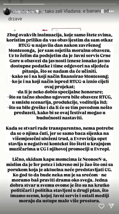 לאחר מכן פרסמה Vladana Vučinić, נציגת 2022 ומנחת הקדם, סטורי, שבו היא מציינת כי התפטרה מרשות השידור אחרי הקדם ומסבירה: "עקב רמיזות, שרק פוגעות בכולם, אני מנצלת את ההזדמנות להודיע לך שהודעתי על התפטרותי לרשות השידור יום לאחר הקדם, כי הרגשתי חובה מוסרית. בנוסף, אני רוצה להזכיר לכם שהשירות הציבורי של מונטנגרו מחויב להציג מידע זמין לציבור לציבור ובכך לענות על השאלות הבאות, ואני מקווה שהם יעשו כן: כיצד ובאיזה אופן מומן הקדם? מי ובאיזה אופן הציג את כל הפרויקט הזה מול רשות השידור? האם מישהו קיבל עמלות מיוחדות? מה בדיוק היו ההתחייבויות של רשות השידור על פי החוזה, מבחינת תסריט, הפקה, בימוי וכו'? מה היו הטעויות והאם נעשה משהו בנידון, כדי שהפסטיבל הזה יוכל להמשיך גם בעתיד? כשהדברים נעשים לא בשקיפות, אין צורך לשתוק על כך, כי זה רק מטיל צל על חודשים של עבודה קשה, והאירוויזיון שוב מוכנס להקשר שלילי, שפוגע במוזיקאים במונטנגרו ובקידומם באירופה. באופן אישי, אני מורידה את הכובע בפני החבר'ה מ-NeonoeN, ואני באמת מצטערת שבעלי מסר עדכני לא ייצגו את מונטנגרו. מי שזה לא יהיה, בהצלחה – אנחנו לא באמת צריכים לעשות דרמה על הכל. דבר אחד טוב בכל זה הוא שלזמן קצר שמנו את הפוליטיקאים והפוליטיקה בצד, ונזכרנו שיש לנו סצנה מוזיקלית, ושהשירות הציבורי וכלי תקשורת אחרים חייבים לתת לה קצת יותר מקום."