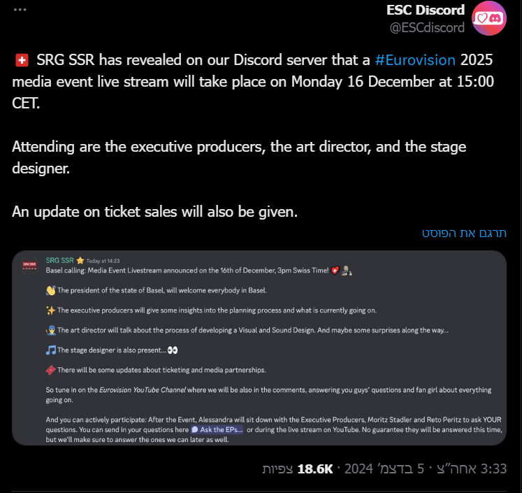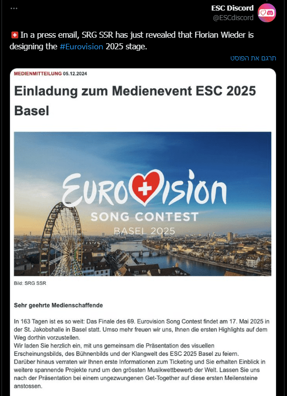 * ב-16/12 בשעה 16:00 ייערך לייב סטרים בנוגע לאירוויזיון 2025. ישתתפו בו בעלי תפקידי מפתח באירוע. יינתן מידע בנוגע למכירת הכרטיסים. נחשף כי Florian Wieder יהיה מעצב הבמה שוב: