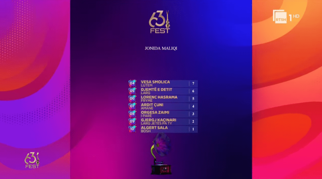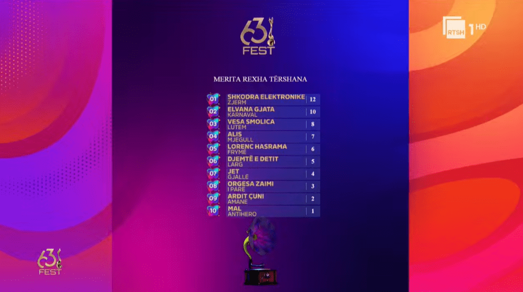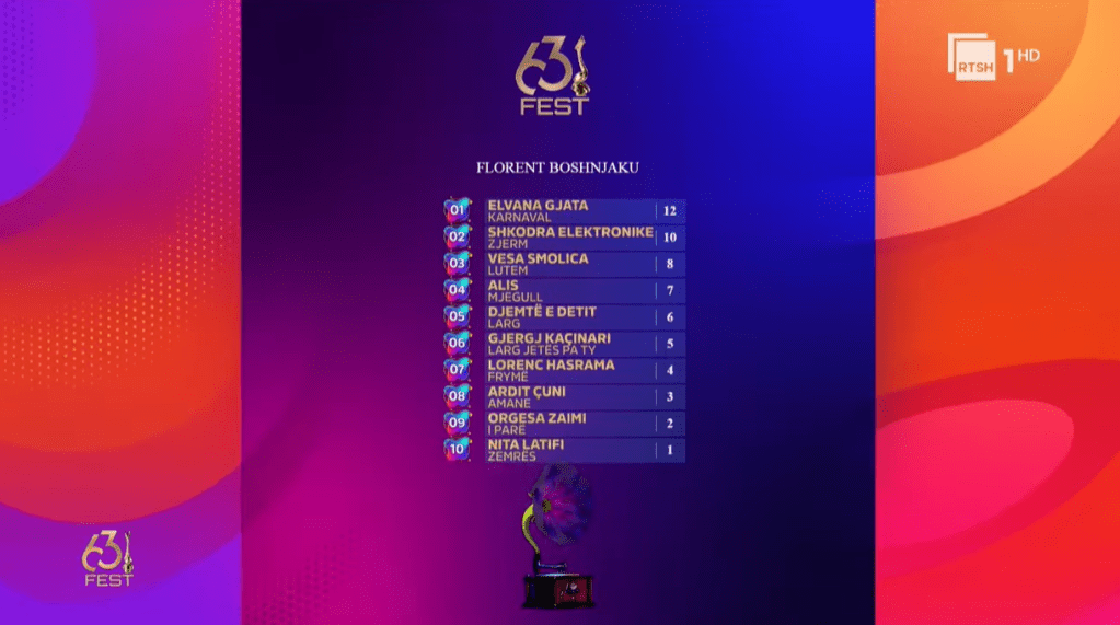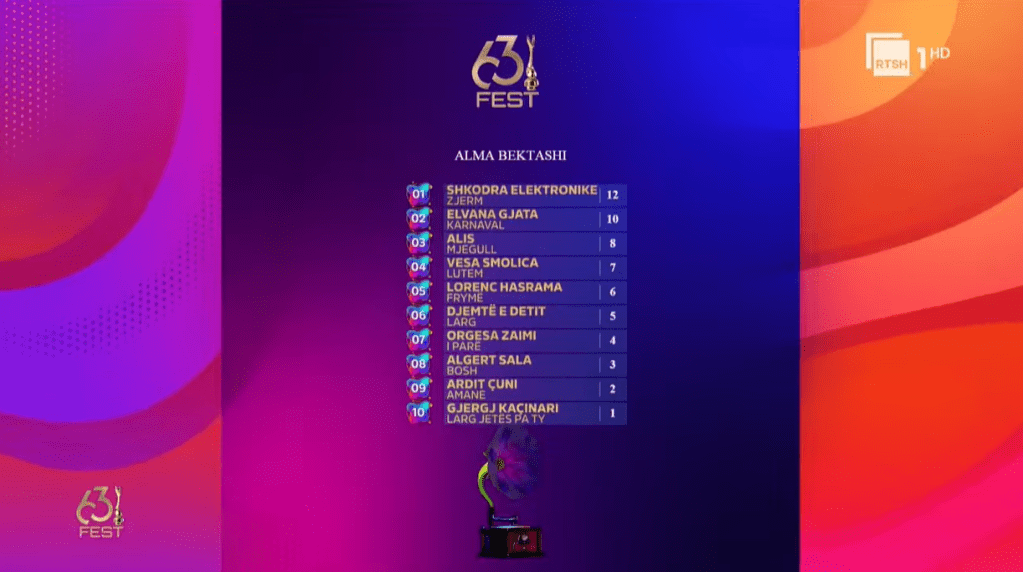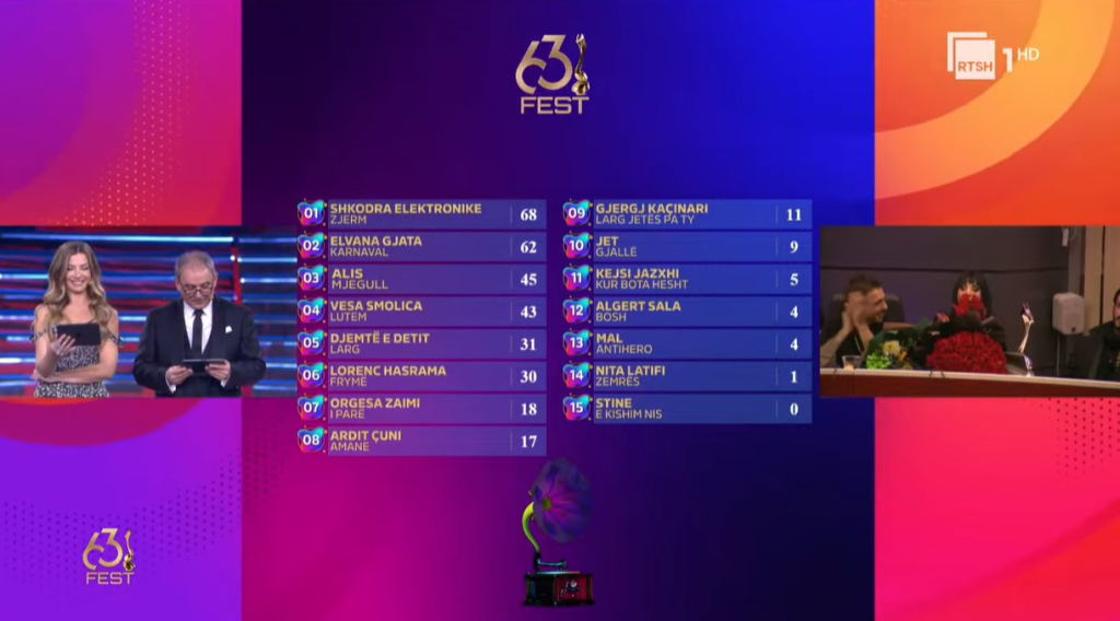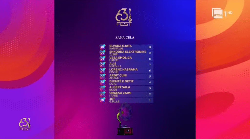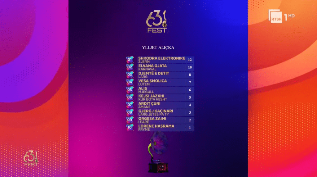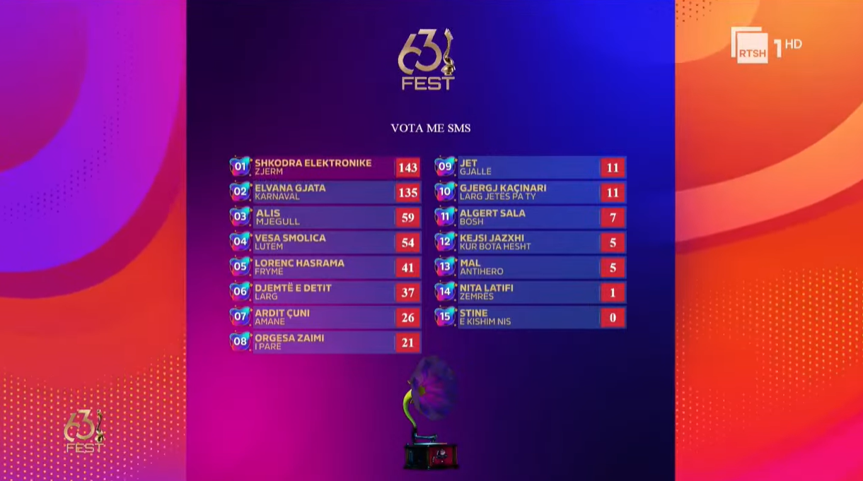 Elvana Gjata עולה למקום הראשון, אחרי ש-Shkodra Elektronike הובילו לאורך רוב הערב. יש קריאות בוז בקהל. עכשיו הצבעת ה-SMS. את המקום השלישי כובש Alis Kallaçi, המקבל גביע. הקרב גם ב-SMS הוא בין Elvana Gjata ל-Shkodra Elektronike. השלושה מוזמנים לבמה. Elvana Gjata מקבלת 19 נקודות מהקהל המקומי, אך האם זה מספיק עבורה לזכייה? Shkodra Elektronike מקבלים 42 נקודות (!) וכובשים את המקום הראשון.