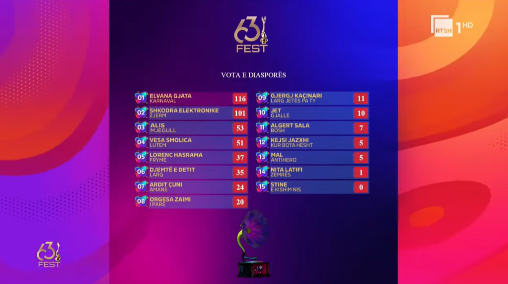 ועכשיו הצבעת הקהל, המחולקת להצבעת התפוצה האלבנית באינטרנט והצבעת הקהל המקומי ב-SMS. תחילה מוצגת הצבעת האינטרנט: