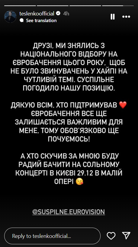 TESLENKO פרש מההתמודדות בשלב ה-Wildcard. הוא איים לפרוש אם ENLEO, שהודה שהוא מאזין למוזיקה רוסית, יתקבל לקדם. אף אחד מהם לא התקבל, ובכל זאת הוא פורש: