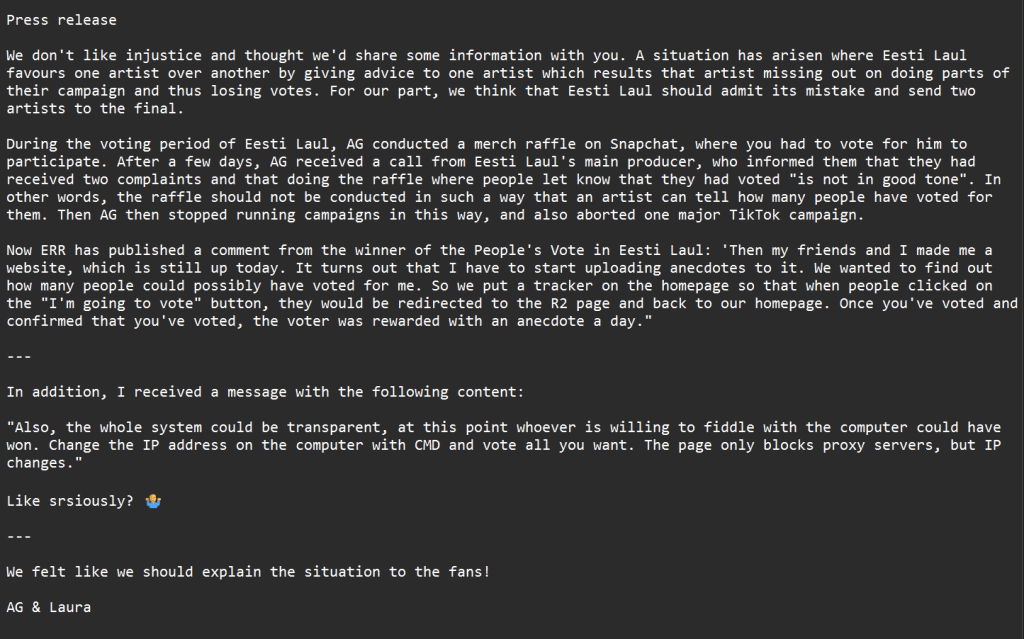 הזוכה ב-Wildcard לקדם האסטוני היא Marta Lotta, והיא תצטרף לקדם האסטוני עם שירה "Tantsin veel". בינתיים, Laura Põldvere, שסיימה במקום השני אחרי Lotta, התלוננה שבעוד שעליה ועל שותפה לדואט נאסר לעשות הגרלה של מרצ'נדייז בקרב המצביעים שלהם, ל-Marta Lotta הותר. הערת המדריך: למעשה, Lotta רק הציעה בדיחות ואנקדוטות למי שהצביע בעדה ולא מוצרים בעלי ערך, אבל כנראה Põldvere מתקשה להבין זאת.